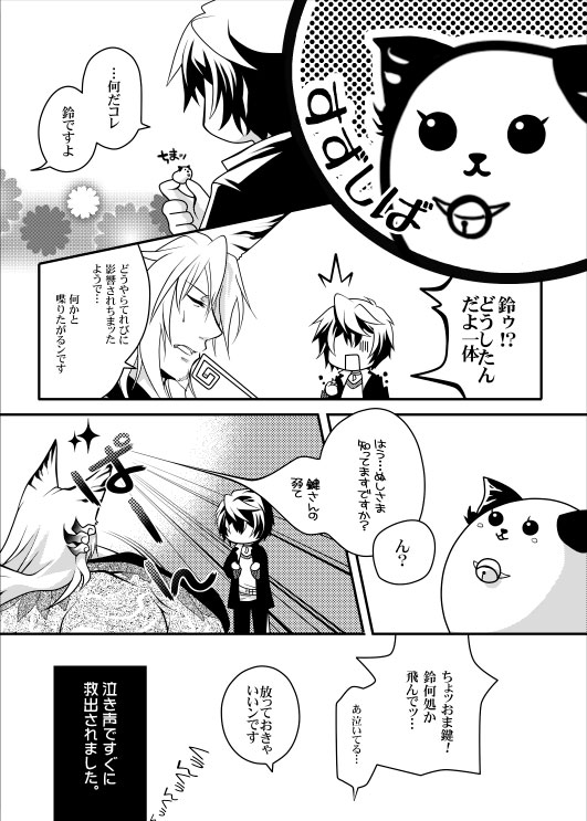 鍵VS千遥のバトルを!!!!!!!バトルををを!!!!!!!!!! そんなわけで漫画。クリックで拡大。 トーンは先に2P目にはったら力尽きたので1P目まっしろです( 隠人鍵ちゃんと本気バトルをかきたくてね!!!!!!!!!!!!!! 鍵ちゃんが手にしたのは紅葉の屑札です。略してま( 零を倒した後に連戦ッて感じでしょうか… 命を懸けた想いには、止めるために命を懸けて戦うしかない。 共に生きられないなら――せめて、その手で。 ですがすいません本はでません(爆) もとは格闘ゲームキャラになったらな診断で、 鍵ちゃんのセリフは?で登場時のセリフが「さあ、遊びましょう」 だったものでそこからぐわっと…ぐわっと(笑) ぶわっと紅葉に包まれて隠人化していくアニメーションとかみたいよね…はふん 2011.12.19 Mon 21:04:15 けーきの日【漫画】クリスマス(っぽい)漫画を目指してかいてみたのですがそれっぽさが欠片もないよ!!! 朝子先生がまともに出来る料理はお母さん特製おいなりさんだけだと思っている。 だがそんな朝子先生と一緒に台所たってわやわやにぎやかに料理したり朝ごはん朝子さんに卵焼きとか作っておいしいわとかにっこりされちゃったりなんだかんだで同棲だしどきどき一つ屋根の下だよ主朝とかいいんじゃないのとか思ってメインにしようとしていた時期もありましたが千遥が鍵ちゃん好きすぎて同じ一つ屋根の下でも朝子先生には手を出せないけれど狐には手をだされまくりというかもうどうにでもなれと 長い そして原稿用の四コマテンプレつかってみた。 元のサイズが大きいので、縮小が汚くなってしまっていますがまあいいや…( すずはきっとケーキのうえにサンタさんとかのせられたら勿体無くて可愛くて食べられなくて、 動物にさらわれたりたべられなくなっちゃったりでくすんくすんなるのだと思う(笑) 2011.07.10 Sun 00:45:01 わたあめ【鍵主漫画】2011.02.12 Sat 01:22:45 すずしばまんが |