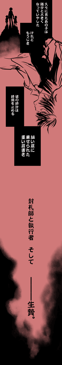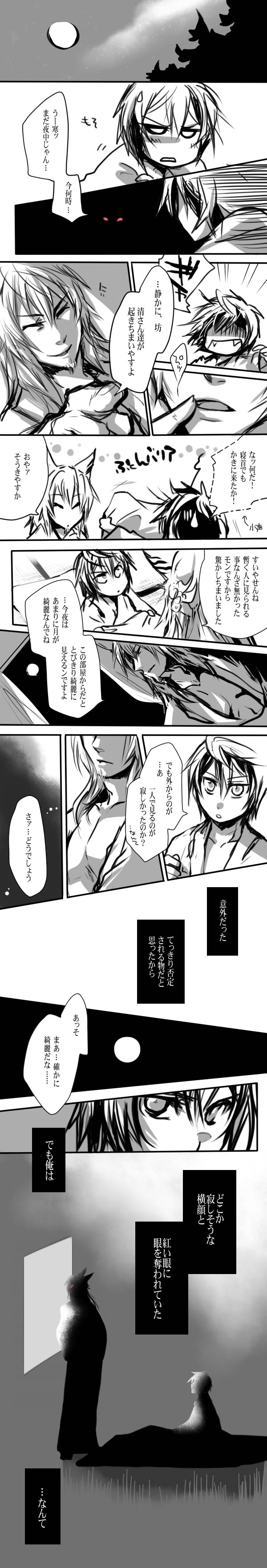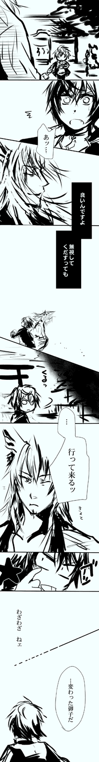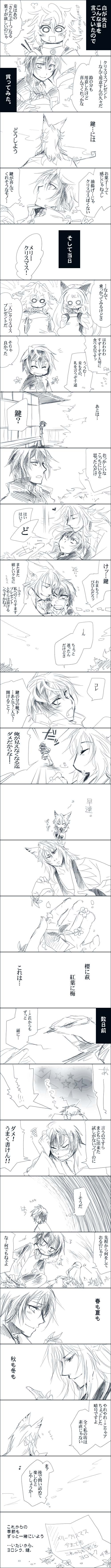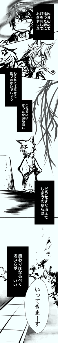 同じようなところぐるんぐるんしてますがお気になさらず…← ■一話目⇒ふたりの、はじまり。 ■二話目⇒月が綺麗ですね この話の鍵ちゃんサイドも後日。 試しに普通の漫画形式にしてみたらムダに長くなってまいました… 追記にずずいとどうぞ。 クリックしたら次のページとか高度なタグははいっとりやせん(爆) …そ、そのうちサイト形式にするよ… PR 2010.12.27 Mon 04:07:17 クリスマスの贈り物【鍵主漫画】2010.09.22 Wed 12:43:13 月が綺麗ですね【鍵主連載・二】本日お月見、十五夜!…という事で、月見ネタを。 十五夜ネタじゃないのですが、まあ月ということで… 今回はつまようじ漫画をむりくりコマ割りしてみた。どうでしょうか。 というわけで、連載二枚目。 ■一話目は⇒こちら …なんですがこの間に挟みたかった話が一個…なので後でナンバリング変えるやもしれぬ 語りとかその他は追記へたたみたたみ。 2010.09.13 Mon 19:23:34 いつかかつ。【鍵主漫画】2010.09.06 Mon 12:17:30 ふたりの、はじまり【鍵主連載・一】 |